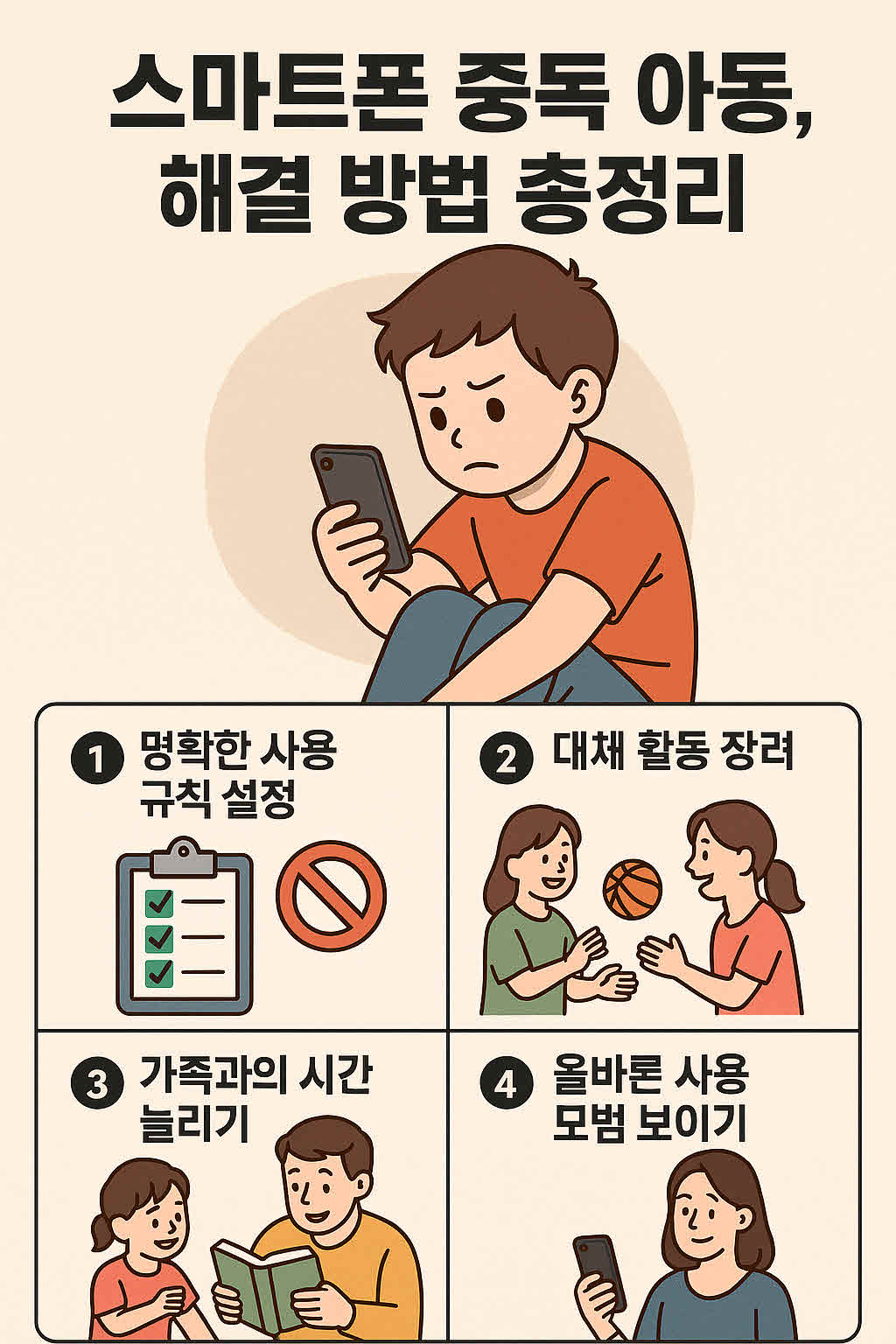 학교나 지역사회 차원에서 스마트폰 사용 교육과 캠페인도 효과가 있어요. 아동 스스로 스마트폰 사용의 적정선을 인지하도록 도와야 해요.